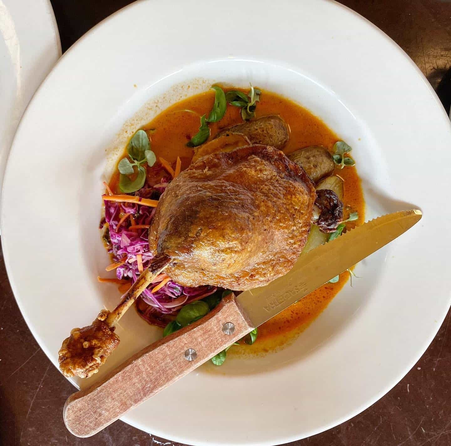 There is a nice selection of main courses.   I have traditionally feasted upon the Duck Confit here. It is an item I do not see available at too many restaurants I frequent. Crispy Duck Confit is a sumptuous dish that combines the rich flavors of duck with a delightful texture.  The term “confit” refers to a method of cooking where the duck is slowly simmered in its own fat until it’s incredibly tender and flavorful. In this process, the meat is seasoned, cooked at a low temperature for several hours, and then stored in fat, which preserves and enhances its taste. To achieve a crispy exterior, the confit duck is typically finished in a hot oven or under a broiler to crisp up the skin. The result is a beautifully crisp, golden-brown skin that contrasts with the tender, succulent meat underneath.     As for the others, one opted for the duck as well while there was also the selection of the petit steak frites, a classic French dish known for its simplicity and deliciousness. The term “petit” means “small,” so the dish features a smaller portion of steak. The steak was seasoned with salt and pepper and grilled to achieve a perfect crust while keeping the inside juicy and tender.