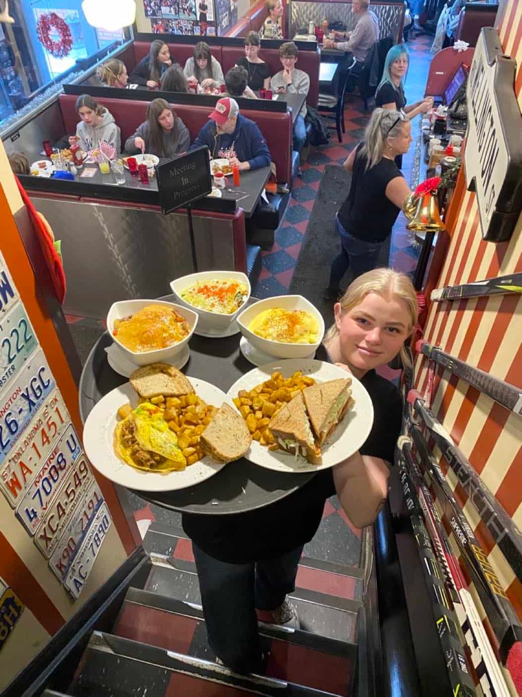 Besides the traditional breakfast-time items of eggs, French toast, pancakes and waffles, there are also poutine and special breakfast pasta and pizza dishes.